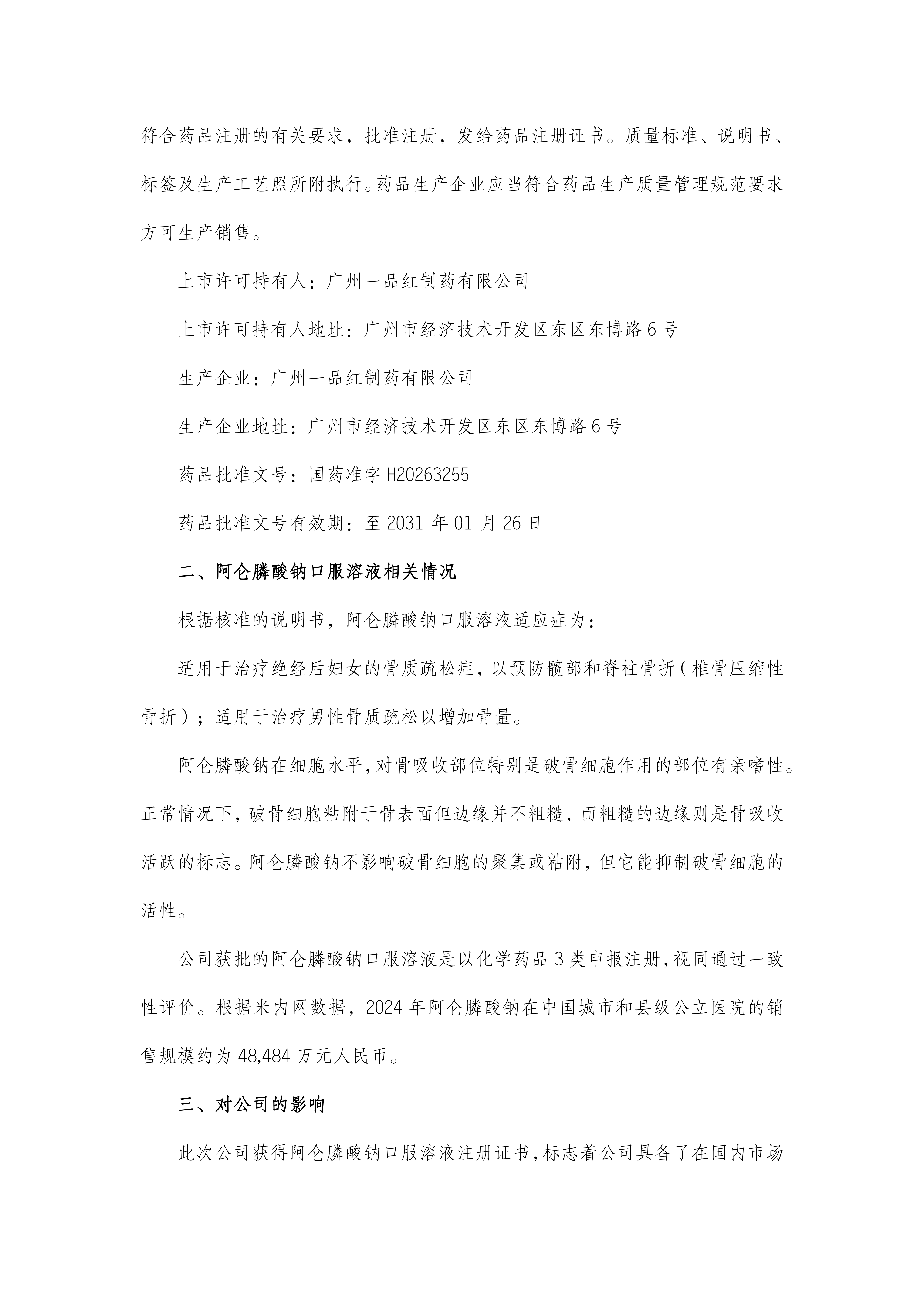 根据《米兰·(milan)药业集团股份有限公司关于全资子公司获得阿仑膦酸钠口服溶液注册证书的公告》(公告编号:2026-006),现予以公告。